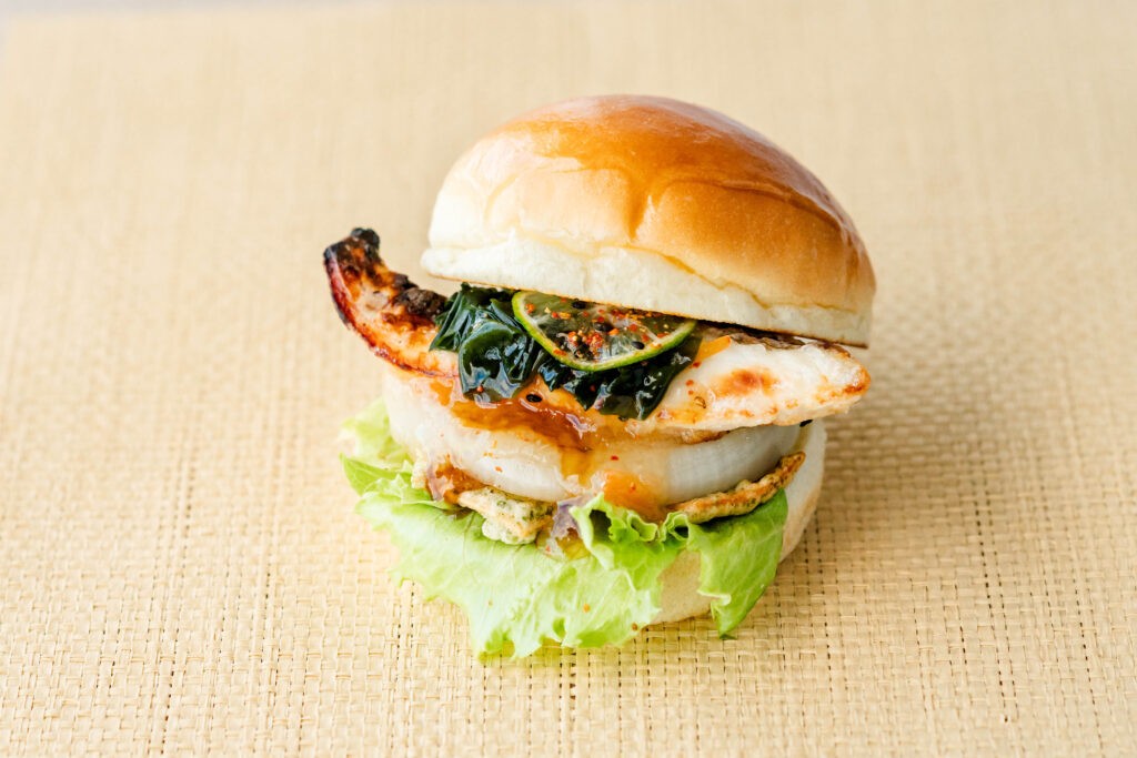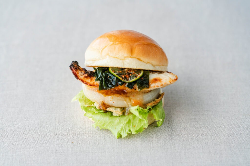 淡路島産玉ねぎステーキ、コリコリ食感の鳴門産わかめ、七味、季節の柑橘を合わせてお楽しみいただける期間限定の和風鯛バーガーです!この機会にぜひ一度お召し上がりください!