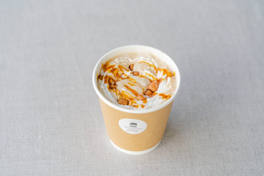 ほっこり甘い鳴門金時の餡に、淡路島牛乳を使ったカフェラテを合わせました。角切りさつまいも、小豆とうぐいす豆、白玉だんごの食感をお楽しみいただけます。ホイップクリームとキャラメルの香りが寒い冬に染み入るホッこり温かい一杯です。
