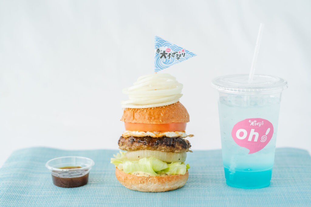 グリルオニオンや合い挽きパティの満足感たっぷりのあわじ島バーガーに、期間限定!そのまま食べてもおいしい淡路島の新玉スライスを大うず風にのっけました!付属ソースでセットサラダとして楽しめます!通常の約2倍のうずしおブルーソーダもセット!