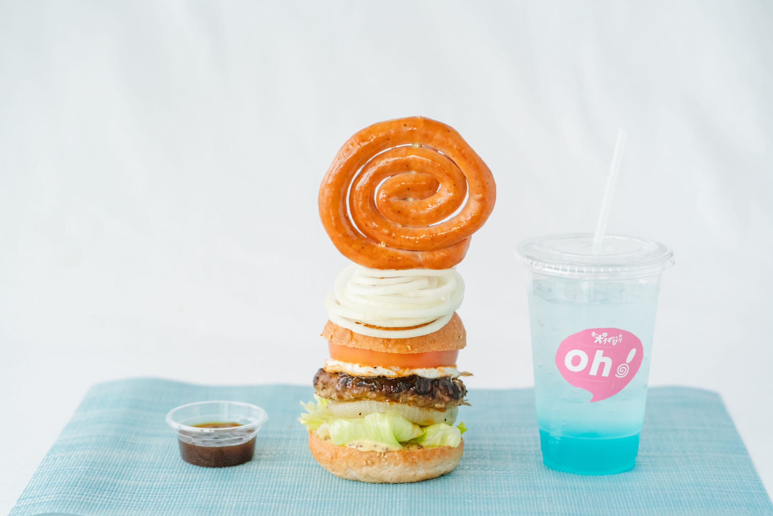 グリルオニオンや合い挽きパティの満足感たっぷりのあわじ島バーガーに、大潮の日限定!えびすもち豚を使用したうずまきソーセージがささっちゃいました!付属ソースでセットサラダとして楽しめます!通常の約2倍のドリンクがセット!