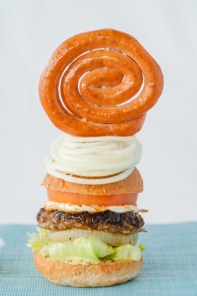 えびすもち豚ソーセージ・バンズ・トマト・オニオンスパイス・卵・オレンジソース・合い挽きパティ・グリルオニオン・レタス・マスタードソース・全粒バンズ
