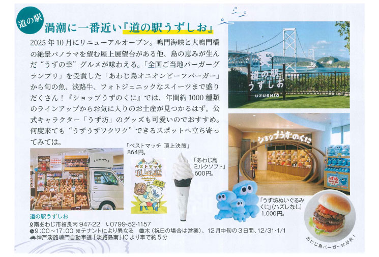 2025年10月にリニューアルオープン。鳴門海峡と大鳴門橋の絶景パノラマを望む屋上展望台がある他、島の恵みが生んだ“うずの幸”グルメが味わえる。「全国ご当地バーガーグランプリ」を受賞した「あわじ島オニオンビーフバーガー」から旬の魚、淡路牛、フォトジェニックなスイーツまで盛りだくさん!『ショップうずのくに』では、年間約1000種類のラインアップからお気に入りのお土産が見つかるはず。公式キャラクター「うず坊」のグッズも可愛いのでおすすめ。